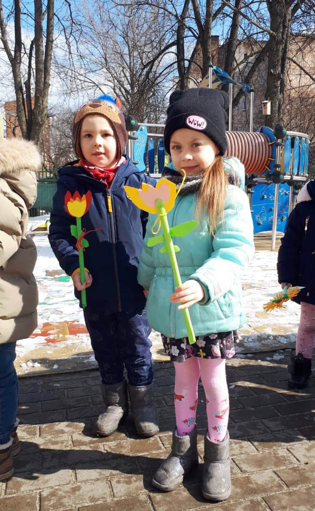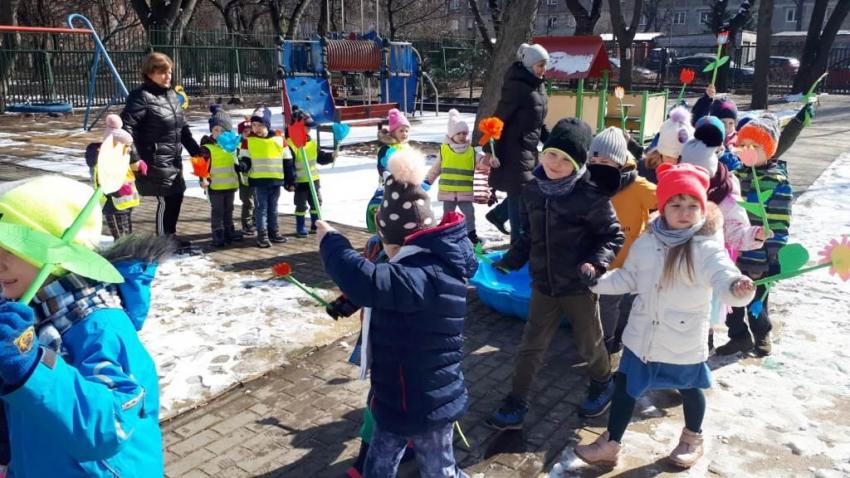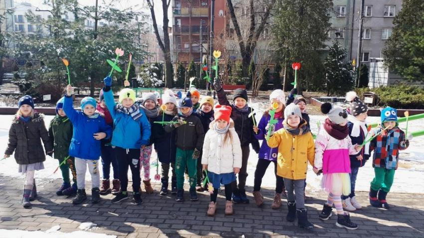 Wszystkie grupy spacerowały machając własnoręcznie wykonanymi kwiatami wokół placu i śpiewały piosenki ,,Maszeruje wiosna", ,,Przyjdźże Ty wiosenko".