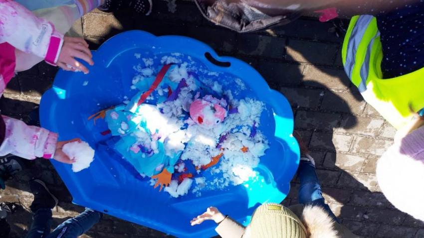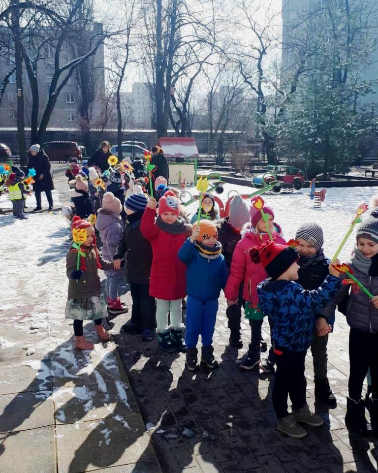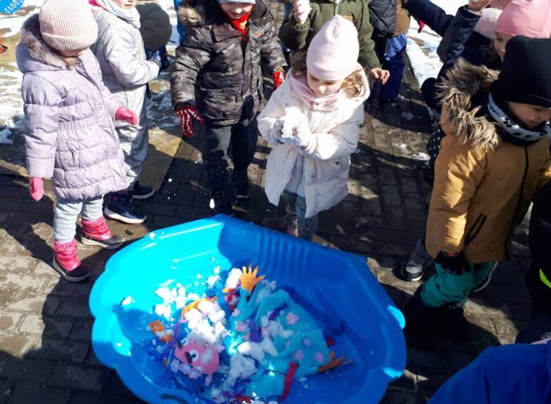 Dzieci z grupy III wykonały piękną Marzannę z kolorowej krepiny, która była symbolem mroźnej zimy. Korzystając z okazji, że tego dnia zagościła u nas zima, dzieci pozbierały niemal cały śnieg z placu zabaw i oddały go Marzannie. Niech zabiera go do Zimowej krainy.