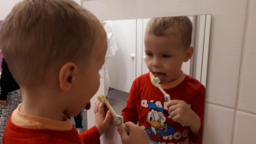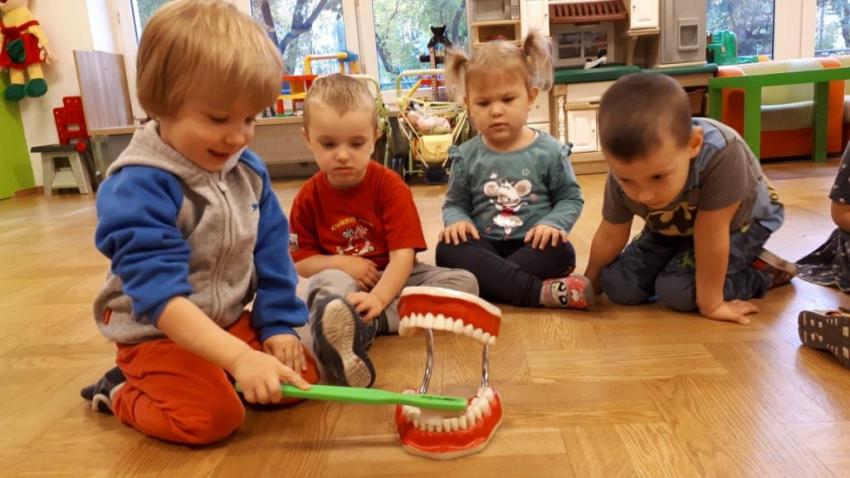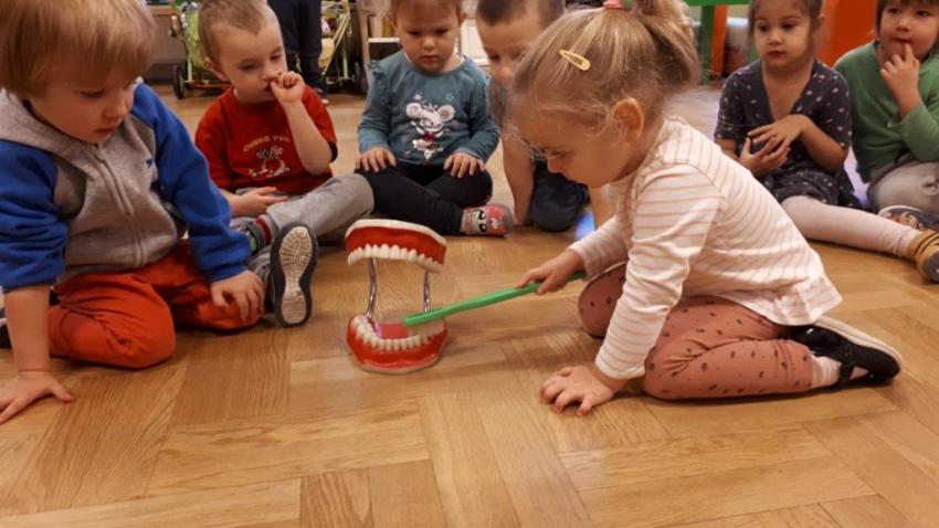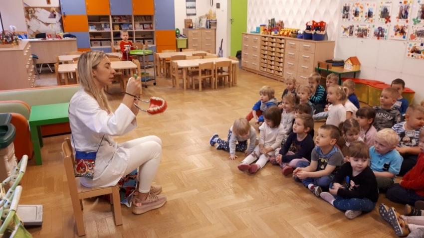24 października 2022 r., w ramach promowania działań sprzyjających kształtowaniu prawidłowych zachowań prozdrowotnych, odbyło się spotkanie z przedstawicielem gabinetu stomatologicznego. Podczas prelekcji przedszkolaki dowiedziały się, co należy robić, aby mieć zdrowe zęby. Dzieci z wielkim zaciekawieniem obejrzały model szczęki oraz obserwowały technikę prawidłowego mycia zębów.