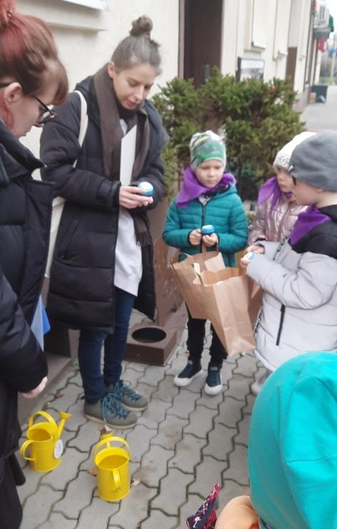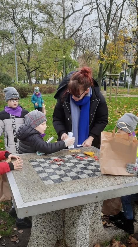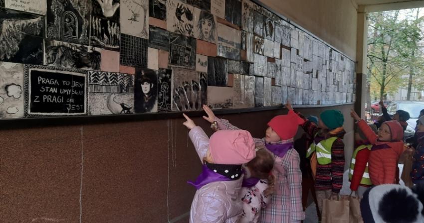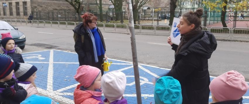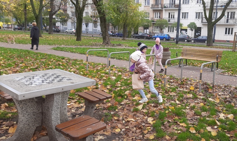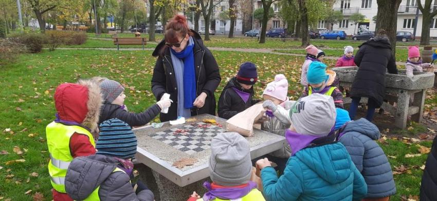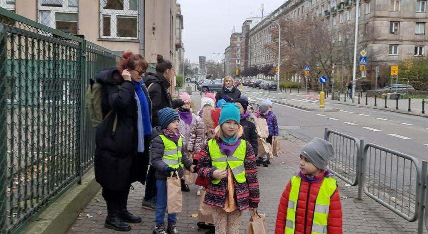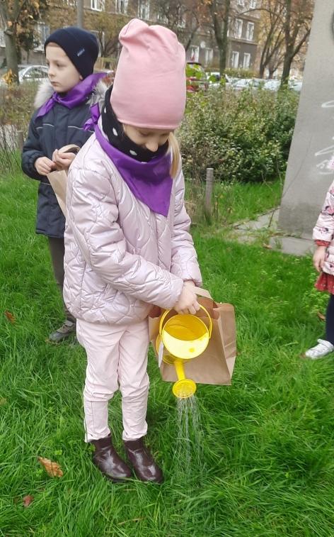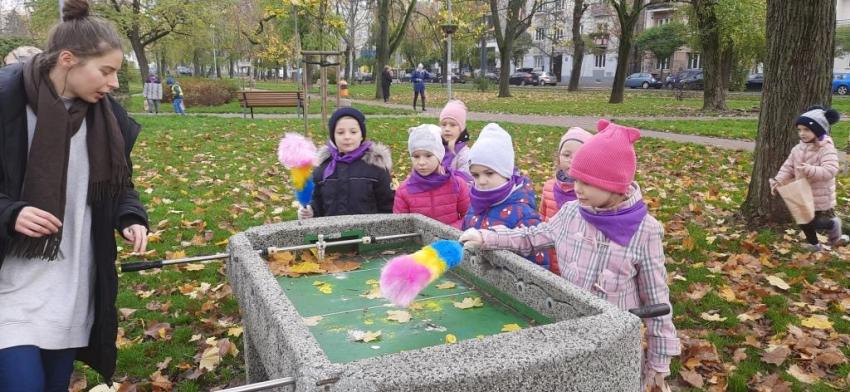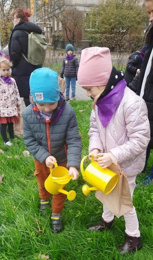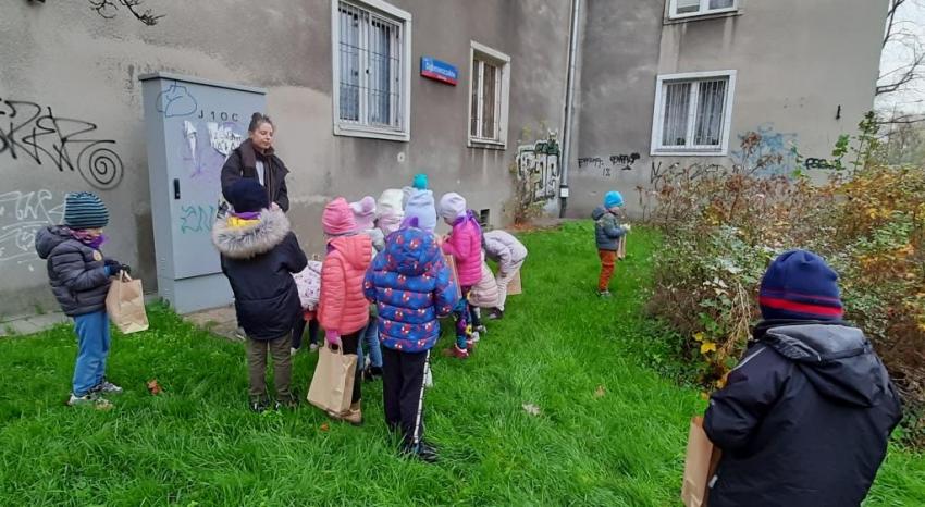 7 listopada, w ramach projektu "Rewitalizacja okiem dziecka", dzieci z grupy IV wyruszyły z pracownikami Domu Kultury Praga Północ na zajęcia w plenerze. Przedszkolaki szukały miejsc parkingowych dla osób niepełnosprawnych, porównywały wielkość miejsc postojowych dla rowerów i aut. Odwiedziły pobliski skwer. Dostrzegły na nim miejsca wymagające uporządkowania. Wyposażone w rękawiczki, miotełki, szufelki przystąpiły do sprzątania okolicy. Kulminacją zajęć w plenerze było wysianie nasion kwiatów, które wiosną ozdobią praskie trawniki.