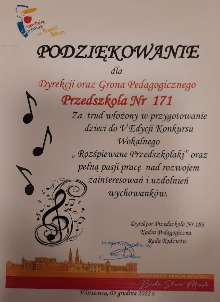 5 grudnia w Przedszkolu nr 186 odbyło się ogłoszenie wyników konkursu pt. ,,Rozśpiewane przedszkolaki". Z przyjemnością informujemy, że Kasia P. z grupy III otrzymała wyróżnienie, a Kira W. i Weronika S. z grupy IV pamiątkowe dyplomy za udział w konkursie.