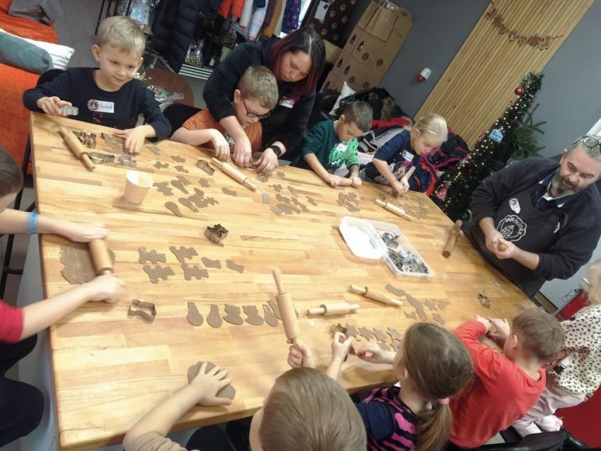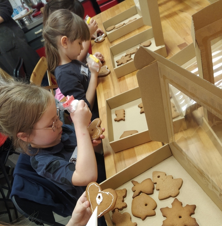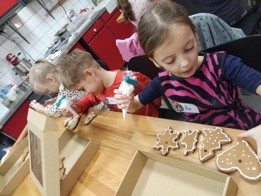 Dzieci z grupy IV uczestniczyły w warsztatach piernikowych zorganizowanych w Warszawskim Domu Piernika znajdującym się nieopodal naszego przedszkola. Na początku dzieci miały za zadanie odgadnąć przepis na pierniczki i rozpoznać potrzebne do tego wypieku przyprawy. Następnie przedszkolaki wałkowały ciasto i wycinały różne kształty. Na końcu samodzielnie dekorowały ciasteczka lukrem przy pomocy profesjonalnego rękawa cukierniczego! To zadanie wymagało dużej sprawności i precyzji. Wszyscy sobie świetnie z tym poradzili. Każdy próbował wykonać dekorację najlepiej jak potrafi. Były to sympatyczne i pięknie pachnące spotkanie. Cieszymy się, że w naszej okolicy jest coraz więcej ciekawych miejsc.