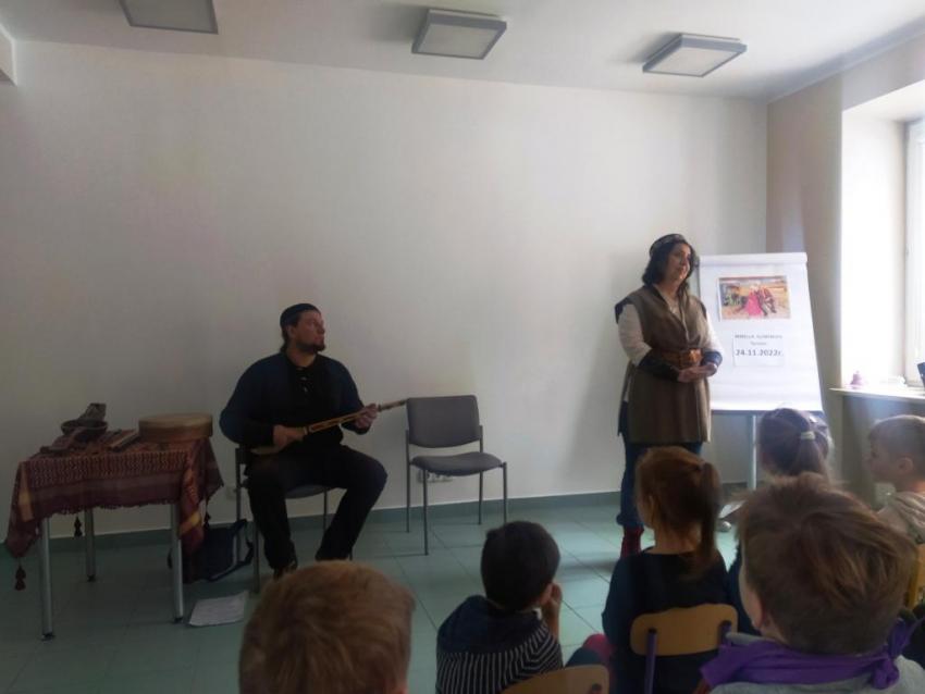 Dzieci z grupy IV uczestniczyły w zajęciach zorganizowanych przez Bibliotekę Publiczną przy ul. Skoczylasa pt. ,,Opowieści ze świata - bajki kazachskie". Opowiadanie wzbogacone było grą na instrumentach oraz śpiewem, który najpierw wszystkich zaskoczył, a później zafascynował i wyzwolił dużo radości i uśmiechu.
