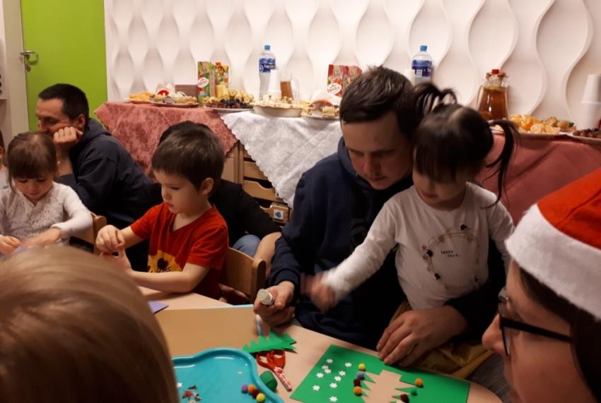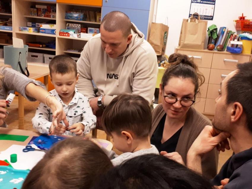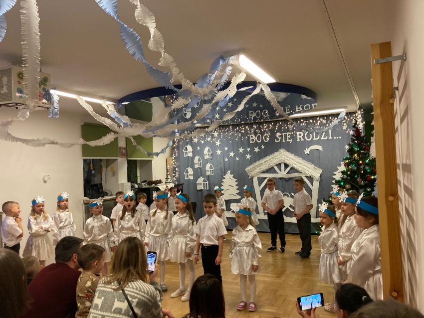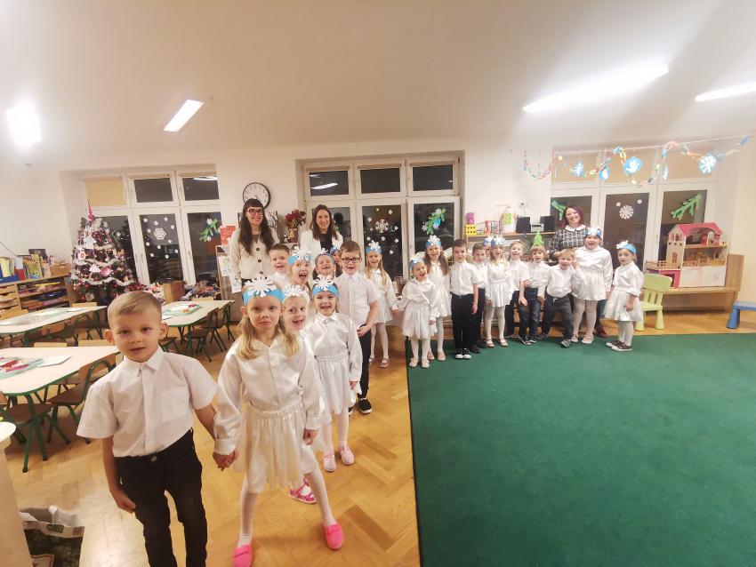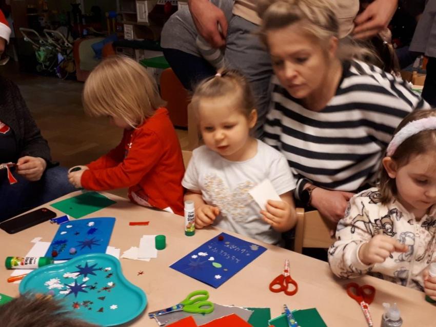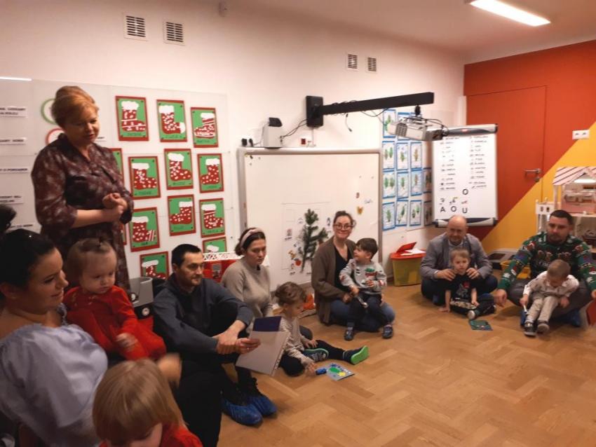 W dniach poprzedzających święta Bożego Narodzenia odbyły się w naszym przedszkolu spotkania z udziałem zaproszonych gości. Przedszkolaki ze starszych grup zaprezentowały krótkie występy artystyczne w postaci inscenizacji, prezentacji wierszy o bożonarodzeniowej tematyce oraz wspólnego śpiewania tradycyjnych kolęd. Duże wzruszenie towarzyszyło rodzicom podczas oglądania nastrojowego tańca ze światełkami. W młodszych grupach spotkanie z rodzicami miało charakter zabawy twórczej. Goście, wspólnie ze swoimi pociechami, wykonywali lampiony oraz kartki świąteczne. Podczas wspólnej pracy wszyscy wykazywali się dużym zaangażowaniem. Był to bardzo miły i wyjątkowy czas.