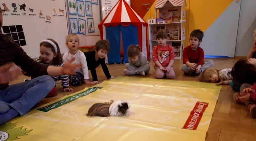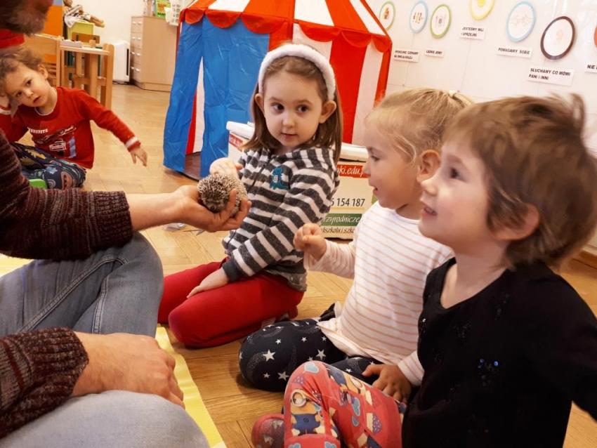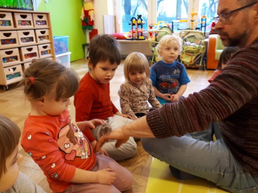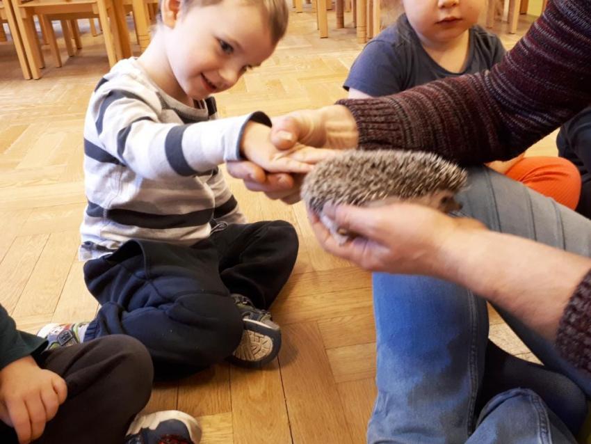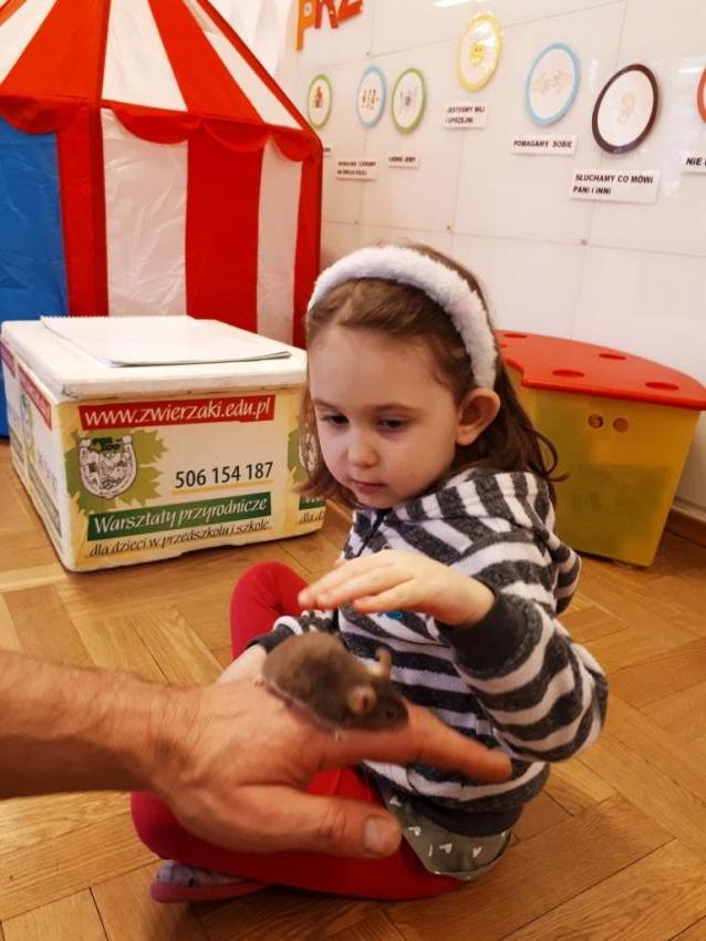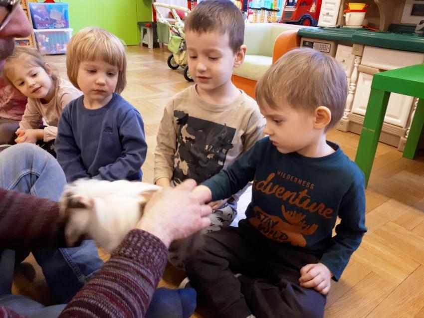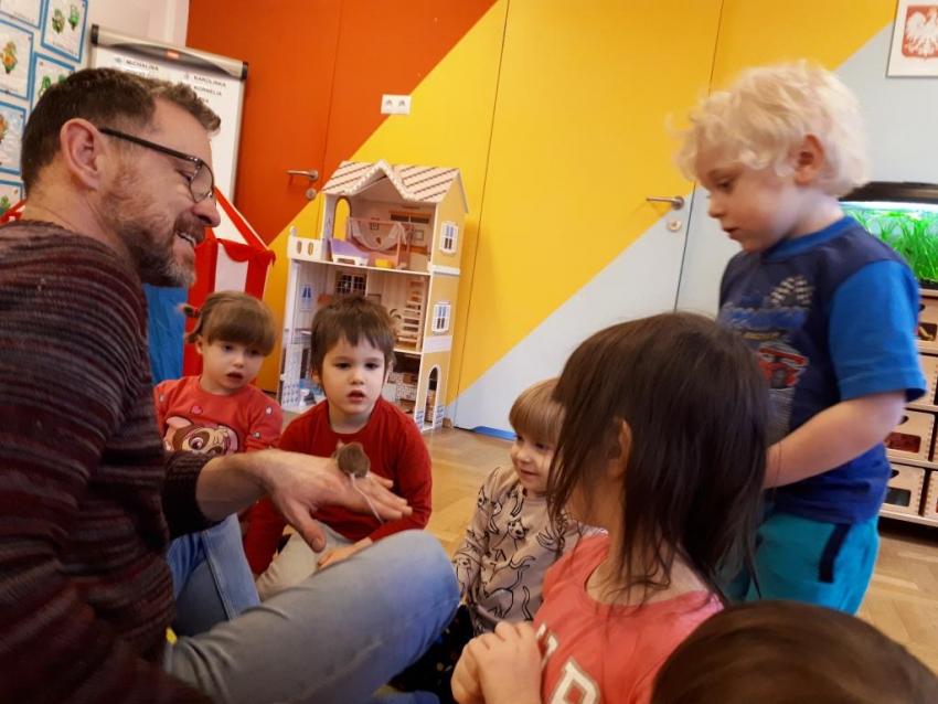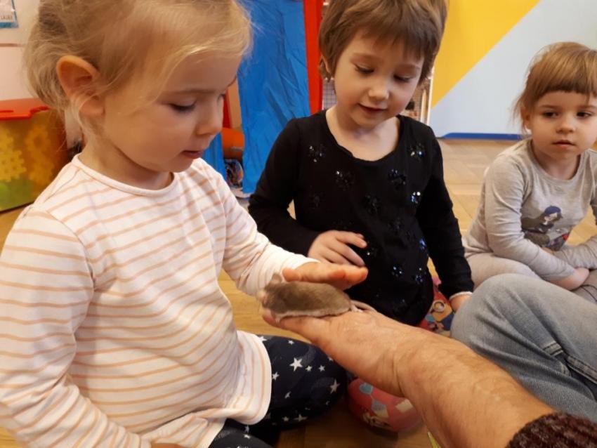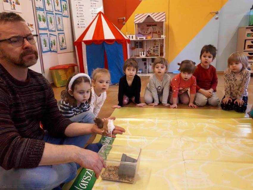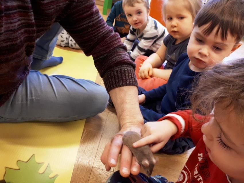 24 stycznia dzieci ze wszystkich grup uczestniczyły w warsztatach przyrodniczych pt. ,,Egzotyczne czy domowe". Warsztaty poprowadził pan Roman Person z Perr - Zoo. Przedszkolaki miały okazję bezpośrednio obserwować ślimaki afrykańskie, patyczaki, jeża pigmejskiego, myszki oraz długowłosą świnkę morską. Umiejętność opowiadania przez pana Romana o ciekawostkach przyrodniczych pobudzała dzieci do stawiania pytań o zwierzętach. Na koniec spotkania każde dziecko miało okazję wskazania zwierzątka, które chętnie by przyjęło pod swój dach.