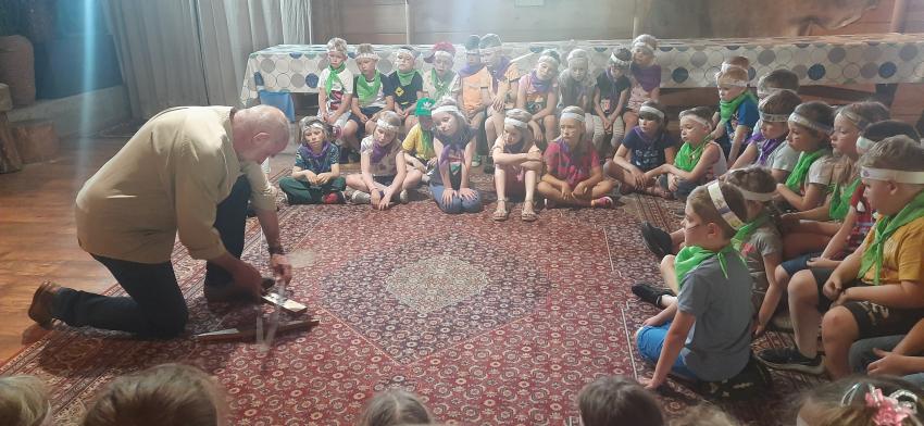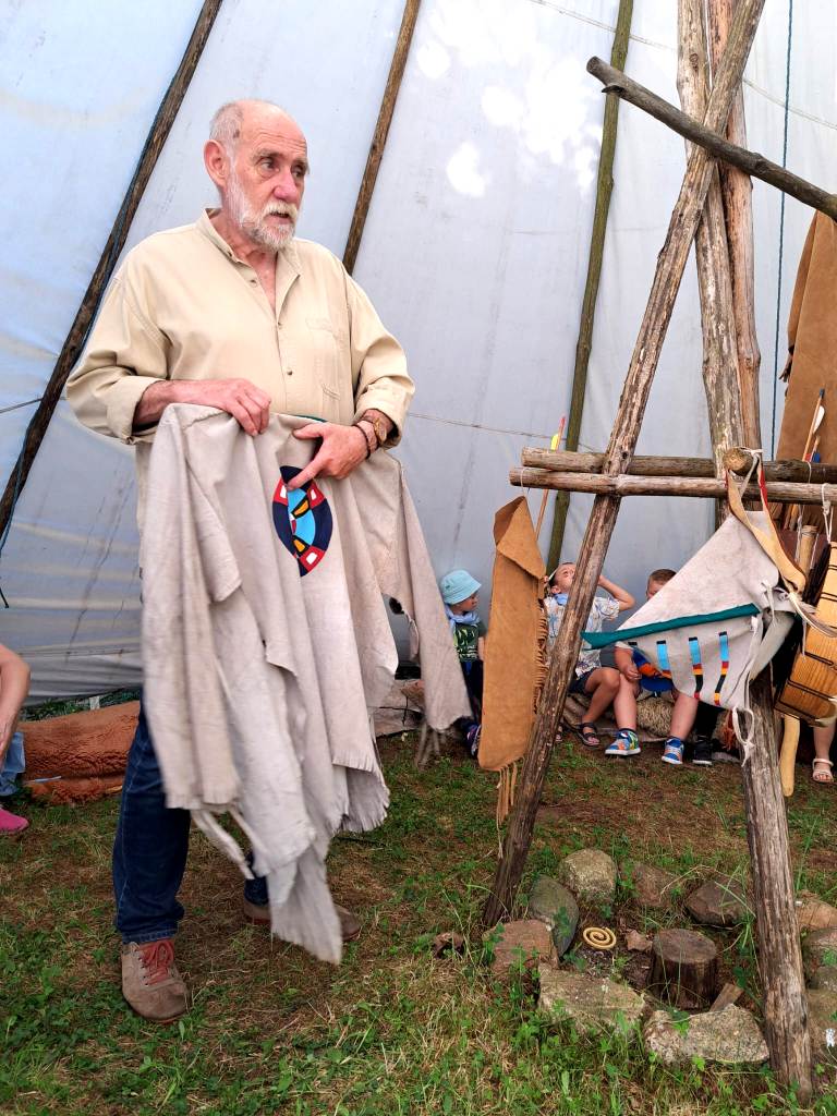 Następnie jako młodzi Indianie wybieraliśmy sobie imię, które ilustowaliśmy na specjalnych opaskach do których zdobywaliśmy pióra. W między czasie dowiedzieliśmy się że łuk nie służył tylko do polowań. Na naszych oczach gospodarz niemal za jego pomocą rozpalił w chacie ognisko!