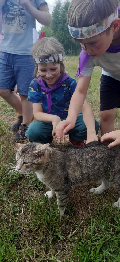 Niesamowite przeżycia uzupełniały zabawy na dużej polanie, pyszne posiłki w warunkach polowych oraz tutejszy kot, który domagał się głaskania na kilka rąk.